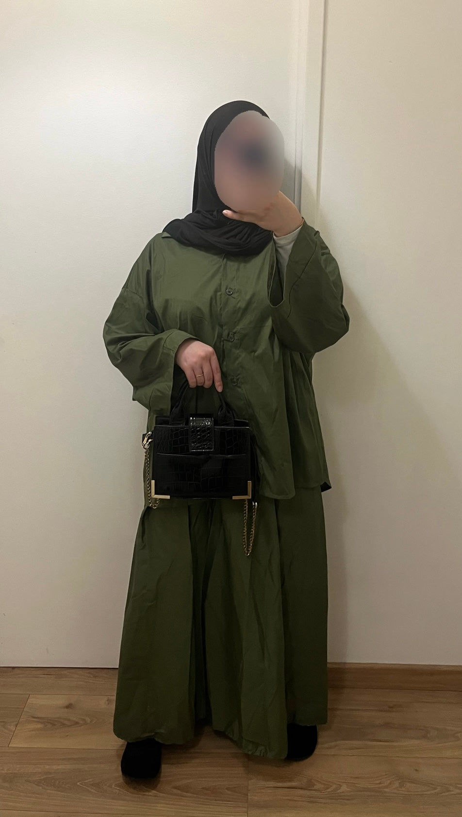 L’ensemble Alya incarne la douceur et le raffinement dans une tenue complète et facile à porter. Il se compose d’une jupe longue évasée et d’une chemise à la coupe droite avec manches larges pour une allure modeste et tendance.